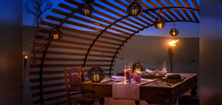 Венцом вечера станет ужин из шести блюд от шеф-повара в непревзойденной атмосфере, полной изыска и романтики. Это лучшее место, чтобы насладиться вкусом жареной утки, овощного мусака, рыбы и креветок на гриле, а также австралийским ангусом. Кроме прочего, гостям предложат ароматный кальян, роспись тела мехенди, а в завершении программы – шоу «Пылающие пески Аравии».